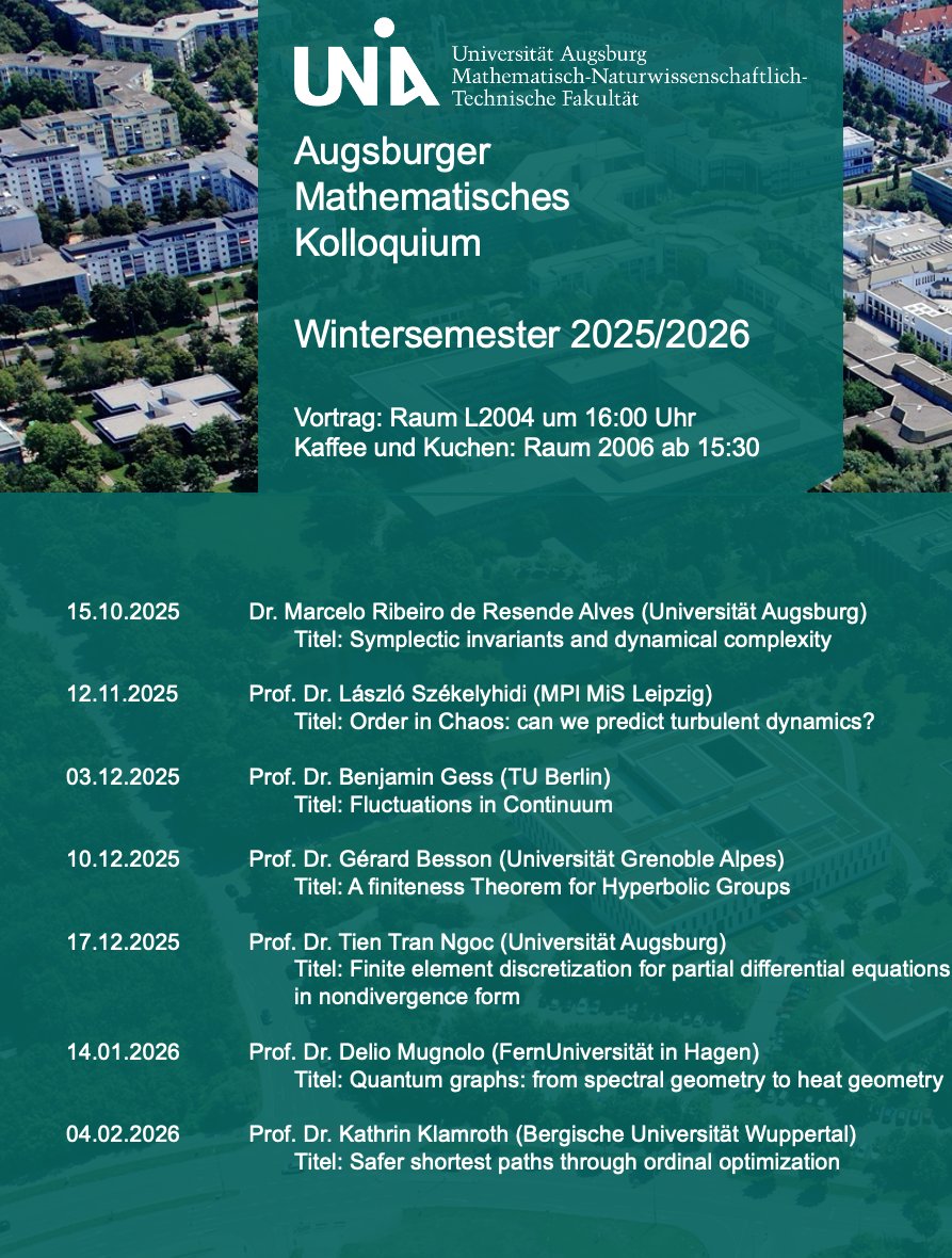 Das Augsburger mathematische Kolloquium ist eine Veranstaltung des Instituts für Mathematik mit dem Ziel, herausragende Sprecherinnen und Sprecher für Vortr?ge zu gewinnen, die für ein breites mathematisches Publikum zug?nglich sind. Vor den eigentlichen Vortr?gen gibt es bei Kaffee und Kuchen die M?glichkeit, sich bereits vorab mit der oder dem Vortragenden auszutauschen.