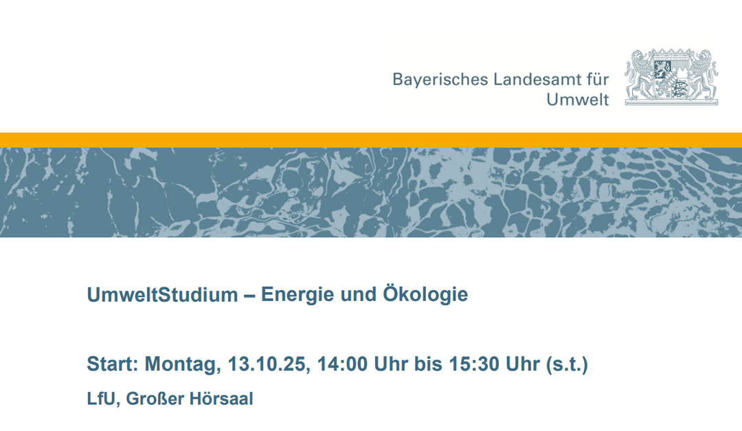 Gemeinsam mit dem Bayerischen Landesamt für Umwelt (LfU) organisiert das Wissenschaftszentrum Umwelt eine einzigartige Vortragsreihe. UmweltStudium wird alle wichtigen Aspekte des praktischen Umweltschutzes, einschlie?lich des Natur- und Klimaschutzes fachlich fundiert und aktuell darstellen. Fachleute des Bayerischen Landesamtes für Umwelt, aber auch Forscherinnen und Forscher der Universit?t Augsburg, der Hochschule Augsburg und weiterer Forschungseinrichtungen bieten Wissen aus erster Hand. Jedes Semester hat die Reihe einen besonderen Schwerpunkt, so im Winteresemester 2025/26 das Thema Energie und ?kologie.